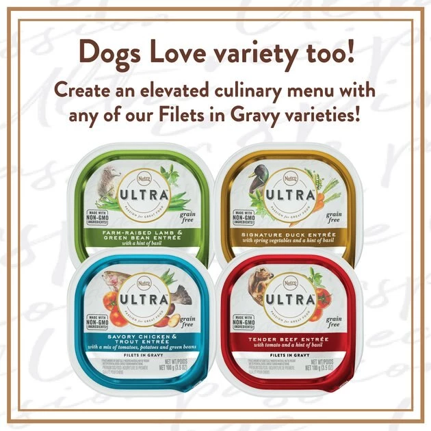 With recipes that will make Fido’s mouth water, Nutro Ultra Grain-Free Filets in Gravy Bistro Mix wet dog food variety pack provides your four-legged friend a tasty meal made from good-for-him ingredients. Each of these food trays features real beef or chicken as the number one ingredient, along with yummy veggies and herbs to add a little extra something for your pup, resulting in a delicious meal that’s rich in nutrients and full of flavor. Made with the highest quality protein and non-GMO ingredients, carefully sourced from a trusted network of farmers and suppliers, this wet dog food is grain-free and contains no chicken by-product meal, corn, wheat, soy, artificial flavors, colors or preservatives.