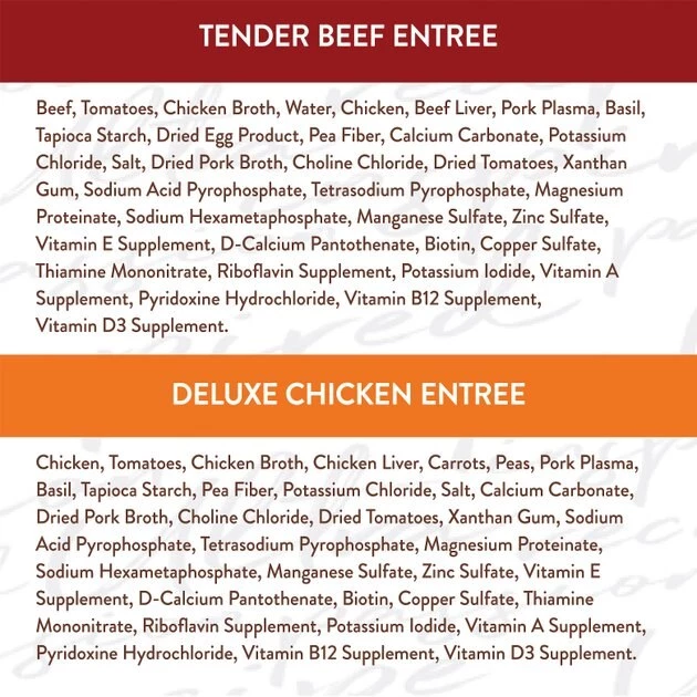 Beef: Beef, Tomatoes, Chicken Broth, Water, Chicken, Beef Liver, Pork Plasma, Basil, Tapioca Starch, Dried Egg Product, Pea Fiber, Calcium Carbonate, Potassium Chloride, Salt, Dried Pork Broth, Choline Chloride, Dried Tomatoes, Xanthan Gum, Sodium Acid Pyrophosphate, Tetrasodium Pyrophosphate, Magnesium Proteinate, Sodium Hexametaphosphate, Manganese Sulfate, Zinc Sulfate, Vitamin E Supplement, D-Calcium Pantothenate, Biotin, Copper Sulfate, Thiamine Mononitrate, Riboflavin Supplement, Potassium Iodide, Vitamin A Supplement, Pyridoxine Hydrochloride, Vitamin B12 Supplement, Vitamin D3 Supplement.