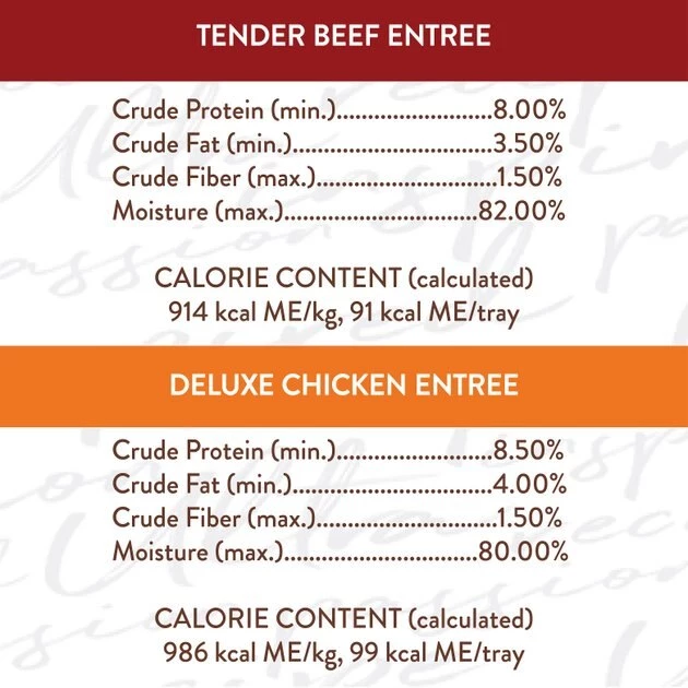 - Contains 2 flavors of Grain-Free Filets in Gravy including Tender Beef Entrée with tomato and a hint of basil and Deluxe Chicken Entrée with tomatoes, spring vegetables and a hint of basil.