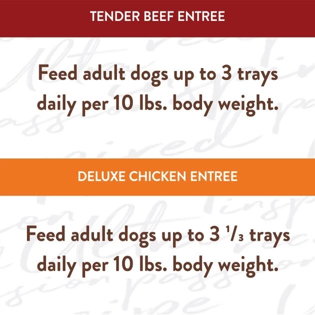 Beef: Feed adult dogs approximately 3 trays daily per 10 lbs of body weight. Adjust to maintain ideal body condition.
