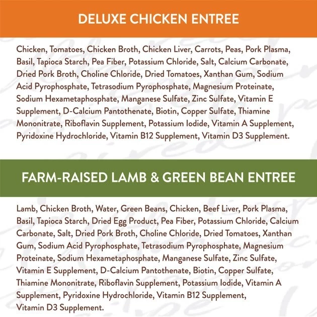 Lamb: Lamb, Chicken Broth, Water, Green Beans, Chicken, Beef Liver, Pork Plasma, Basil, Tapioca Starch, Dried Egg Product, Pea Fiber, Potassium Chloride, Calcium Carbonate, Salt, Dried Pork Broth, Choline Chloride, Dried Tomatoes, Xanthan Gum, Sodium Acid Pyrophosphate, Tetrasodium Pyrophosphate, Magnesium Proteinate, Sodium Hexametaphosphate, Manganese Sulfate, Zinc Sulfate, Vitamin E Supplement, D-Calcium Pantothenate, Biotin, Copper Sulfate, Thiamine Mononitrate, Riboflavin Supplement, Potassium Iodide, Vitamin A Supplement, Pyridoxine Hydrochloride, Vitamin B12 Supplement, Vitamin D3 Supplement.