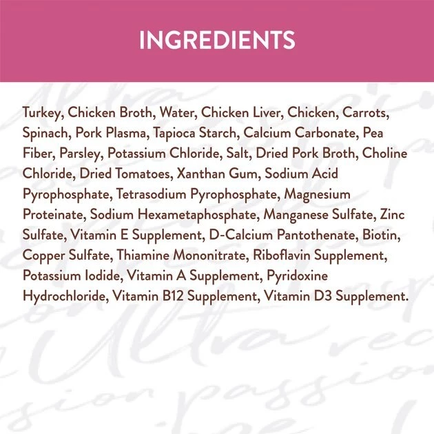 Turkey, Chicken Broth, Water, Chicken Liver, Chicken, Carrots, Spinach, Pork Plasma, Tapioca Starch, Calcium Carbonate, Pea Fiber, Parsley, Potassium Chloride, Salt, Dried Pork Broth, Choline Chloride, Dried Tomatoes, Xanthan Gum, Sodium Acid Pyrophosphate, Tetrasodium Pyrophosphate, Magnesium Proteinate, Sodium Hexametaphosphate, Manganese Sulfate, Zinc Sulfate, Vitamin E Supplement, D-Calcium Pantothenate, Biotin, Copper Sulfate, Thiamine Mononitrate, Riboflavin Supplement, Potassium Iodide, Vitamin A Supplement, Pyridoxine Hydrochloride, Vitamin B12 Supplement, Vitamin D3 Supplement.
