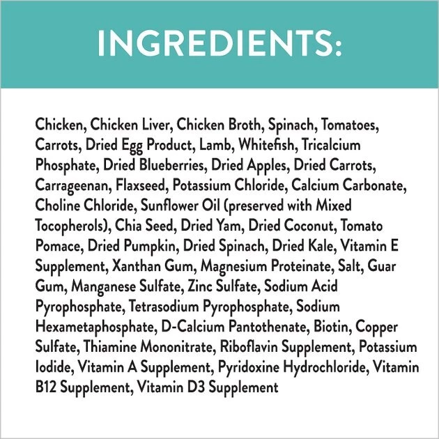 Chicken, Chicken Liver, Chicken Broth, Spinach, Tomatoes, Carrots, Dried Egg Product, Lamb, Whitefish, Tricalcium Phosphate, Dried Blueberries, Dried Apples, Dried Carrots, Carrageenan, Flaxseed, Potassium Chloride, Calcium Carbonate, Choline Chloride, Sunflower Oil (preserved with Mixed Tocopherols), Chia Seed, Dried Yam, Dried Coconut, Tomato Pomace, Dried Pumpkin, Dried Spinach, Dried Kale, Vitamin E Supplement, Xanthan Gum, Magnesium Proteinate, Salt, Guar Gum, Manganese Sulfate, Zinc Sulfate, Sodium Acid Pryophosphate, Tetrasodium Pyrophosphate, Sodium Hexametaphosphate, D-Calcium Pantothenate, Biotin, Copper Sulfate, Thiamine Mononitrate, Riboflavin Supplement, Potassium Iodide, Vitamin A Supplement, Pyridoxine Hydrochloride, Vitamin B12 Supplement, Vitamin D3 Supplement.