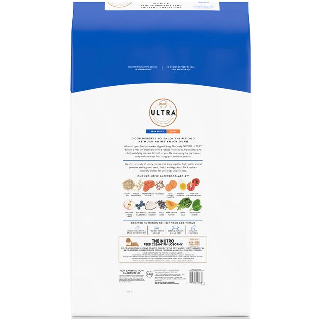 Make your paw-fect puppy’s mealtime nutritious and delicious with Nutro Ultra Large Breed Puppy Dry Dog Food. Specially formulated for large breed puppies, these tasty, dry recipes start with real chicken as the main ingredient—no chicken by-product meal here. Add lamb, salmon, and a blend of 15 superfoods and you have a mouthwatering, healthy meal. Sourced from trusted farmers, the high quality, non-GMO ingredients provide a balanced, nutrient rich puppy diet that helps keep your big furbaby’s coat and skin healthy. Plus there are no artificial flavors, colors, or preservatives and it is free of corn, wheat, and soy protein. Your growing pup will love to eat this flavorful, nourishing kibble!