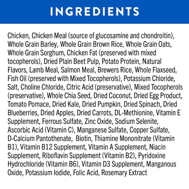 New: Chicken, Chicken Meal (source of glucosamine and chondroitin), Whole Grain Barley, Whole Grain Brown Rice, Whole Grain Oats, Whole Grain Sorghum, Chicken Fat (preserved with mixed tocopherols), Dried Plain Beet Pulp, Potato Protein, Natural Flavors, Lamb Meal, Salmon Meal, Brewers Rice, Whole Flaxseed, Fish Oil (preserved with Mixed Tocopherols), Potassium Chloride, Salt, Choline Chloride, Citric Acid (preservative), Mixed Tocopherols (preservative), Whole Chia Seed, Dried Coconut, Dried Egg Product, Tomato Pomace, Dried Kale, Dried Pumpkin, Dried Spinach, Dried Blueberries, Dried Apples, Dried Carrots, DL-Methionine, Vitamin E Supplement, Ferrous Sulfate, Zinc Oxide, Sodium Selenite, Ascorbic Acid (Vitamin C), Manganese Sulfate, Copper Sulfate, D-Calcium Pantothenate, Biotin, Thiamine Mononitrate (Vitamin B1), Vitamin B12 Supplement, Vitamin A Supplement, Niacin Supplement, Riboflavin Supplement (Vitamin B2), Pyridoxine Hydrochloride (Vitamin B6), Vitamin D3 Supplement, Manganous Oxide, Potassium Iodide, Folic Acid, Rosemary Extract.