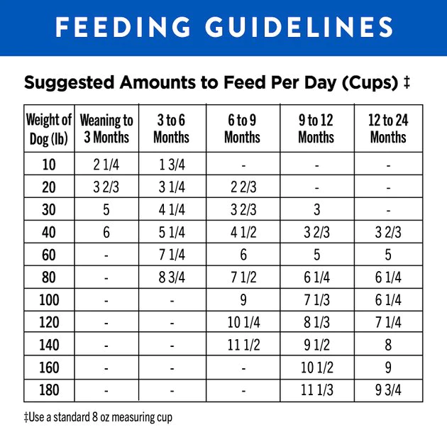 | 30 lbs | 5 cups | 4 1/4 cups | 3 2/3 cups | 3 cups | – |
