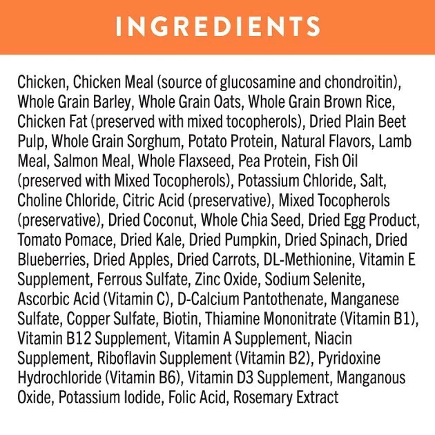New: Chicken, Chicken Meal (source of glucosamine and chondroitin), Whole Grain Barley, Whole Grain Oats, Whole Grain Brown Rice, Chicken Fat (preserved with mixed tocopherols), Dried Plain Beet Pulp, Whole Grain Sorghum, Potato Protein, Natural Flavors, Lamb Meal, Salmon Meal, Whole Flaxseed, Pea Protein, Fish Oil (preserved with Mixed Tocopherols), Potassium Chloride, Salt, Choline Chloride, Citric Acid (preservative), Mixed Tocopherols (preservative), Dried Coconut, Whole Chia Seed, Dried Egg Product, Tomato Pomace, Dried Kale, Dried Pumpkin, Dried Spinach, Dried Blueberries, Dried Apples, Dried Carrots, , DL-Methionine, Vitamin E Supplement, Ferrous Sulfate, Zinc Oxide, Sodium Selenite, Ascorbic Acid (Vitamin C), D-Calcium Pantothenate, Manganese Sulfate, Copper Sulfate, Biotin, Thiamine Mononitrate (Vitamin B1), Vitamin B12 Supplement, Vitamin A Supplement, Niacin Supplement, Riboflavin Supplement (Vitamin B2), Pyridoxine Hydrochloride (Vitamin B6), Vitamin D3 Supplement, Manganous Oxide, Potassium Iodide, Folic Acid, Rosemary Extract.