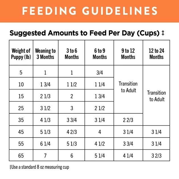 | Weight of Puppy | Weaning to 3 Months | 3 – 6 Months | 6 – 9 Months | 9 – 12 Months | 12 – 24 Months |