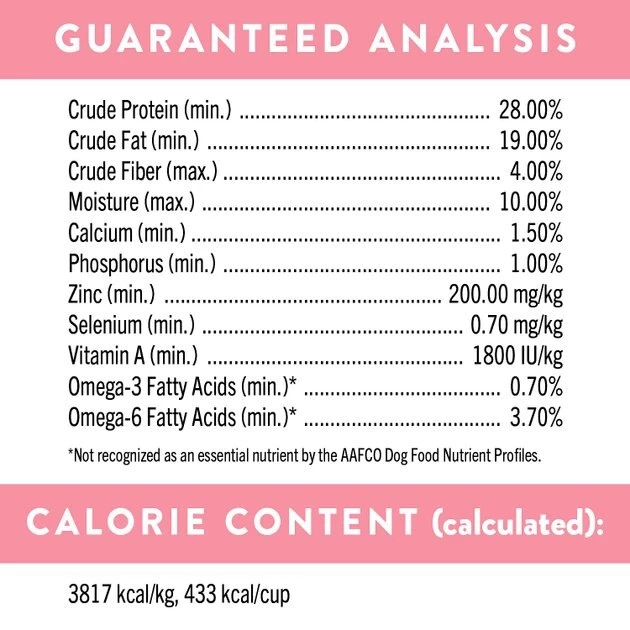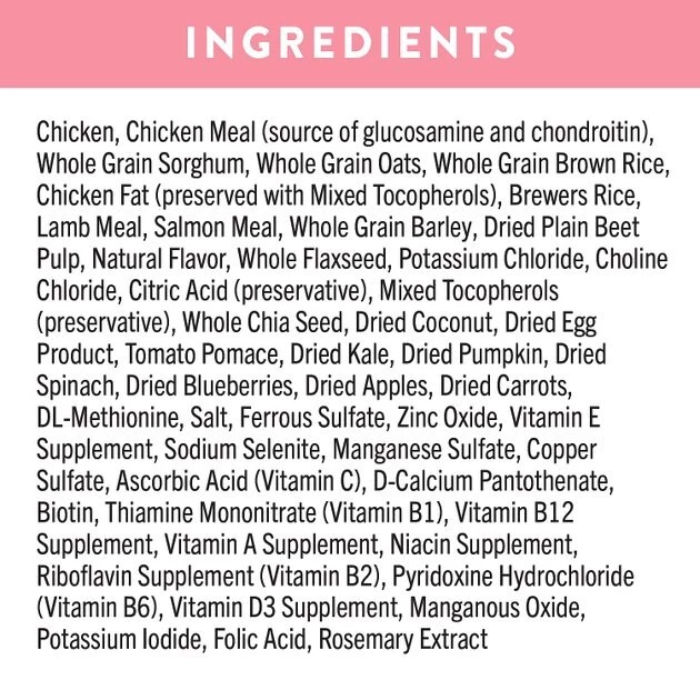 New: Chicken, Chicken Meal (source of glucosamine and chondroitin), Whole Grain Sorghum, Whole Grain Oats, Whole Grain Brown Rice, Chicken Fat (preserved with Mixed Tocopherols), Brewers Rice, Lamb Meal, Salmon Meal, Whole Grain Barley, Dried Plain Beet Pulp, Natural Flavor, Whole Flaxseed, Potassium Chloride, Choline Chloride, Citric Acid (preservative), Mixed Tocopherols (preservative), Whole Chia Seed, Dried Coconut, Dried Egg Product, Tomato Pomace, Dried Kale, Dried Pumpkin, Dried Spinach, Dried Blueberries, Dried Apples, Dried Carrots, DL-Methionine, Salt, Ferrous Sulfate, Zinc Oxide, Vitamin E Supplement, Sodium Selenite, Manganese Sulfate, Copper Sulfate, Ascorbic Acid (Vitamin C), D-Calcium Pantothenate, Biotin, Thiamine Mononitrate (Vitamin B1), Vitamin B12 Supplement, Vitamin A Supplement, Niacin Supplement, Riboflavin Supplement (Vitamin B2), Pyridoxine Hydrochloride (Vitamin B6), Vitamin D3 Supplement, Manganous Oxide, Potassium Iodide, Folic Acid, Rosemary Extract.