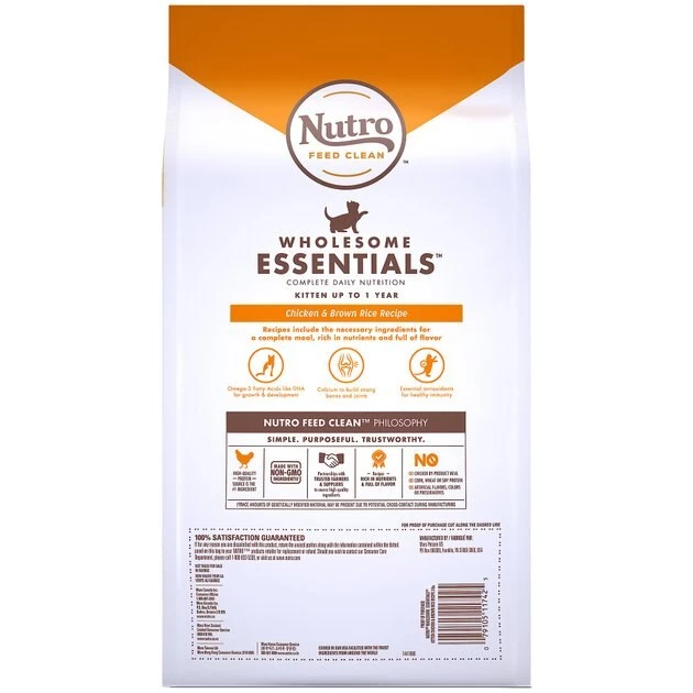 Give your growing kitty the nutrition he needs with the flavor he craves by serving up a bowl of Nutro’s Wholesome Essentials Chicken & Brown Rice Recipe Kitten Dry Cat Food. Made with real chicken as the first ingredient, this recipe packs everything your growing kitten needs. It’s loaded with omega-3 fatty acids for healthy growth and development, antioxidants like DHA to support a healthy immune system, and calcium to help build strong joints and bones. Best of all, there are zero GMOs, corn, wheat, soy protein, chicken by-product meal or artificial colors, flavors or preservatives! Finally, a kibble you can feel good about giving to your paw-tner.