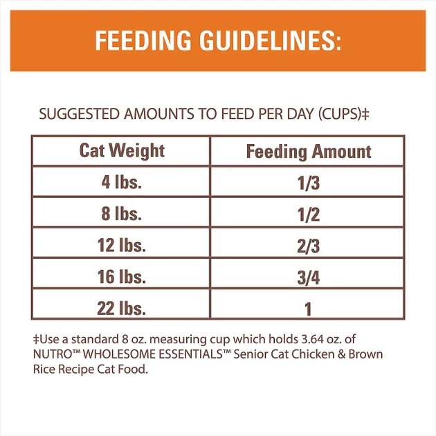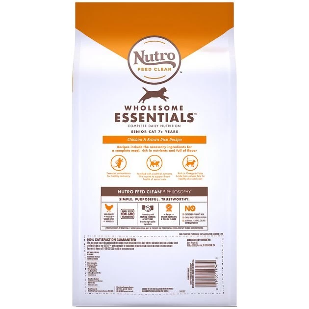Give your senior sidekick the wholesome goodness he craves with Nutro Wholesome Essentials Chicken & Brown Rice Recipe Senior Dry Cat Food. Made with real chicken as the first ingredient, this food offers plenty of protein for healthy muscles and a delicious flavor to keep your sidekick satisfied. It also contains essential nutrients like taurine to support your aging kitty’s heart, plus omega-6 fatty acids to promote healthy skin and a soft, shiny coat. Best of all, there are zero GMOs, corn, wheat, soy protein, chicken by-product meal or artificial colors, flavors or preservatives! Finally, a kibble you can feel good about giving to your paw-tner.
