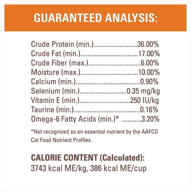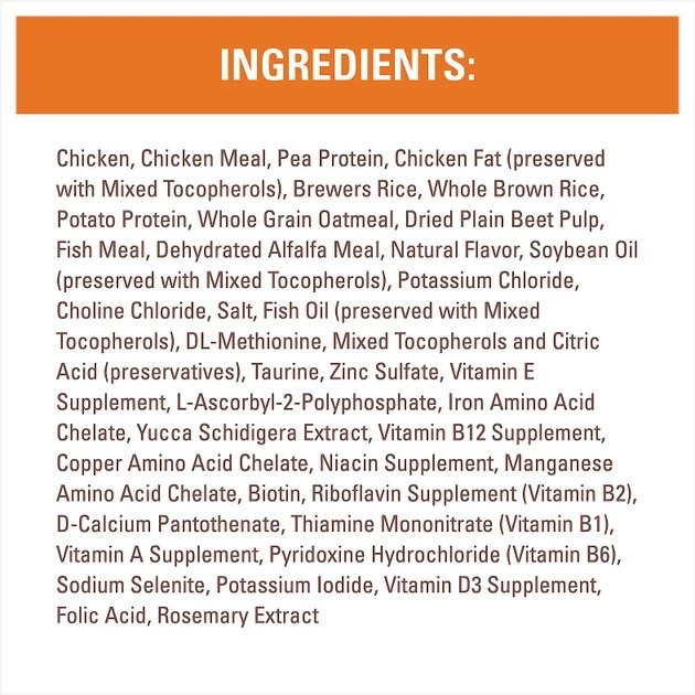 Chicken, Chicken Meal, Pea Protein, Whole Brown Rice, Chicken Fat (Preserved with Mixed Tocopherols), Brewer’s Rice, Dehydrated Alfalfa Meal, Potato Protein, Whole Grain Oatmeal, Flaxseed, Dried Plain Beet Pulp, Natural Flavors, Potassium Chloride, Fish Oil (Preserved with Mixed Tocopherols), Soybean Oil (Preserved with Mixed Tocopherols), Choline Chloride, Salt, Dl-Methionine, Taurine, Vitamin E Supplement, Zinc Sulfate, L-Ascorbyl-2-Polyphosphate (Source of Vitamin C), Iron Amino Acid Chelate, Yucca Schidigera Extract, Vitamin B12 Supplement, Copper Amino Acid Chelate, Niacin Supplement, Sodium Selenite, Manganese Amino Acid Chelate, Biotin, Riboflavin Supplement (Vitamin B2), Calcium Pantothenate, Potassium Iodide, Thiamine Mononitrate (Vitamin B1), Vitamin A Supplement, Pyridoxine Hydrochloride (Vitamin B6), Vitamin D3 Supplement, Folic Acid, Rosemary Extract, Decaffeinated Green Tea Extract, Spearmint Extract.