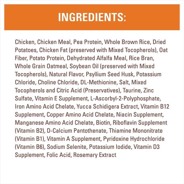 Chicken, Chicken Meal, Pea Protein, Whole Brown Rice, Dried Potatoes, Chicken Fat (preserved with Mixed Tocopherols), Oat Fiber, Potato Protein, Dehydrated Alfalfa Meal, Rice Bran, Whole Grain Oatmeal, Soybean Oil (preserved with Mixed Tocopherols), Natural Flavor, Psyllium Seed Husk, Potassium Chloride, Choline Chloride, DL-Methionine, Salt, Mixed Tocopherols and Citric Acid (Preservatives), Taurine, Zinc Sulfate, Vitamin E Supplement, L-Ascorbyl-2-Polyphosphate, Iron Amino Acid Chelate, Yucca Schidigera Extract, Vitamin B12 Supplement, Copper Amino Acid Chelate, Niacin Supplement, Manganese Amino Acid Chelate, Biotin, Riboflavin Supplement (Vitamin B2), D-Calcium Pantothenate, Thiamine Mononitrate (Vitamin B1), Vitamin A Supplement, Pyridoxine Hydrochloride (Vitamin B6), Sodium Selenite, Potassium Iodide, Vitamin D3 Supplement, Folic Acid, Rosemary Extract.