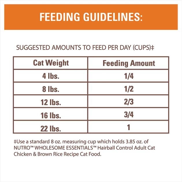 Bring on the goodness and skip the hairballs with the Nutro Wholesome Essentials Hairball Control Chicken & Brown Rice Recipe Adult Dry Cat Food. Made with farm-raised chicken as the first ingredient, this food offers clean nutrition in every bite with plenty of protein for healthy muscles and a delicious flavor to keep your sidekick satisfied. The formula contains a natural fiber blend that helps minimize hairballs, for more yum with less mess. It’s packed with everything your pal needs to look and feel his best, like antioxidants for healthy immunity and omega-6 fatty acids for healthy skin and a soft, shiny coat. Plus, you won’t find any GMOs, corn, wheat, soy protein, chicken by-product meal or artificial colors, flavors or preservatives! Finally, a kibble you can feel good about giving to your adult cat.